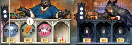 12. 選択した進路カードをマーケットボードの左上に裏向きに置きます。その横に残りの4枚の進路カードを裏向きにして、左から右に数字の昇順に配置します。