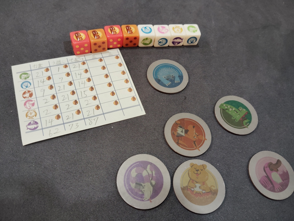 動物も6種類いて、毎回1種類だけ得点化していくので徐々に選択肢は無くなっていくので数字の出目が良くても動物が揃わないと得点無しもありえます。