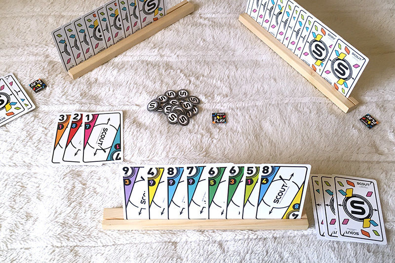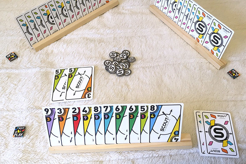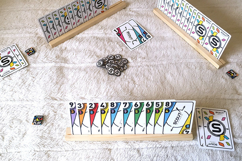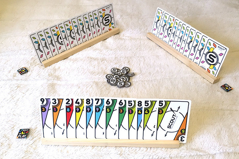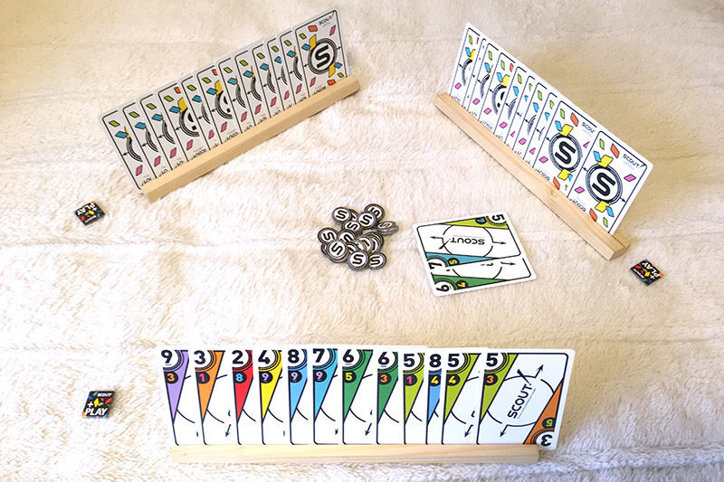 スカウトは、場札の両端のいずれか(1枚しかなければそのカード)を取り、自分の手札の好きな場所に、好きな向きで加える。
