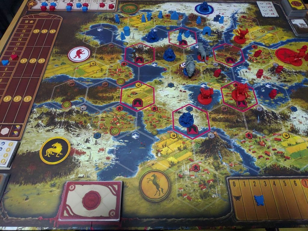 ここで第3軍が出現し、RPGボドゲに片足ツッコむような感じに。どうにか自分が勝利条件をもぎ取ったものの支配地域数の差で敗北。ちょっと勝利条件達成に執着し過ぎたかな。もう少し足元固めてからでもよかったかも