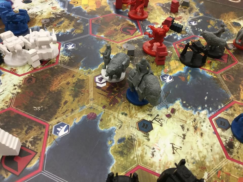 内政プレイ 青 ノルディックが目的カードの達成のためにトンネル上にメックとヒーローを展開してきました。内政3つと戦闘1つの星と目的カードで最速で星5になり,ゲームは一気に終盤です。 黒 私はこのトンネル上に置かれた 青 のメックとヒーローに対して同時に2ヶ所で戦闘し,勝利。 黒 の特殊能力で星5になります。ただ次の手番で 赤 も戦闘で6つの星を稼ぎ,ゲーム終了です。
