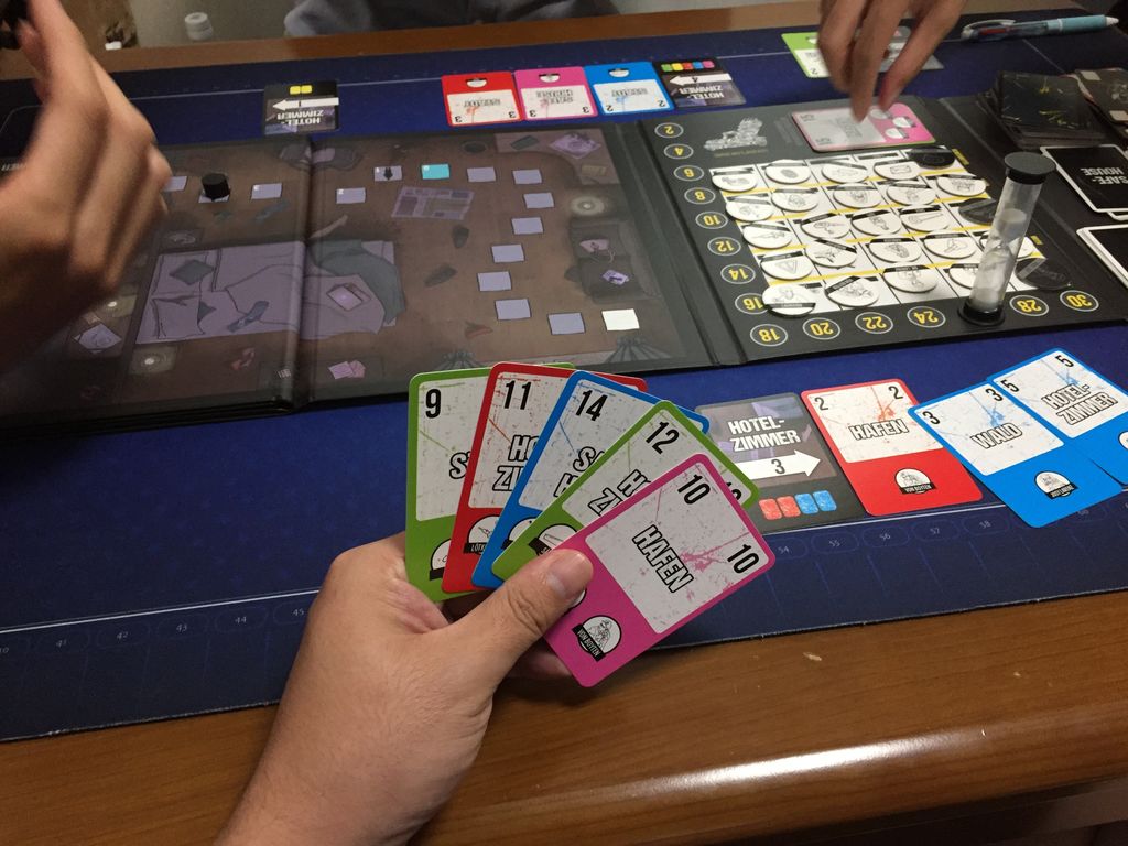 ですが、山札にはマーダーのコマ(黒色)を進ませるものもあります。追いつかれずに、セーフハウスに着く必要があります(追いつかれたら、そこで負け。終了です)