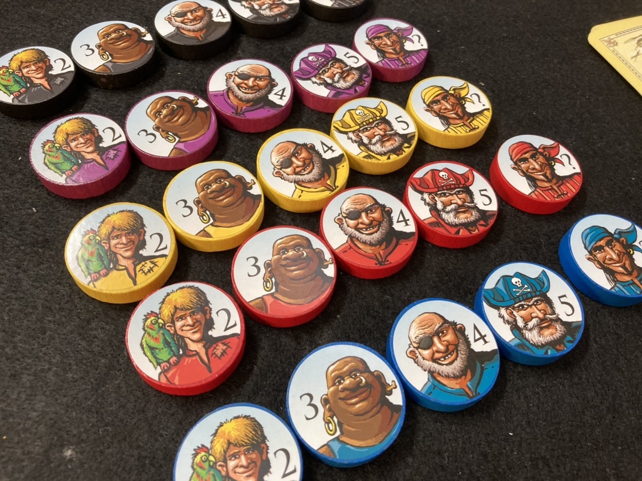 各自が色の異なる海賊たちを5人ずつ受け持ちます。木製円形ディスクに、付属のシールを貼って海賊にしますが、海外物なので予想通りというか、全員人相の悪いおっさんばかり…。ううむ、もう少し華やかにならんものか、などと思ってしまうのは日本人の悪しき習慣か。笑。