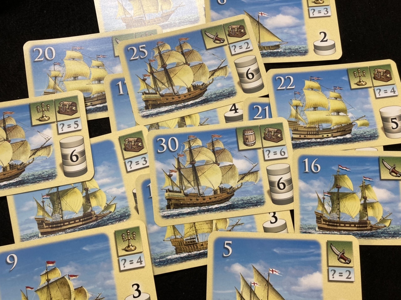 場の中央には「商船カード」全15枚のうちランダムに3枚を公開します。(なくなったら次の3枚を公開する)※すまん、有利不利が出ちゃうような気がしてウチらずっと5枚でやってた。