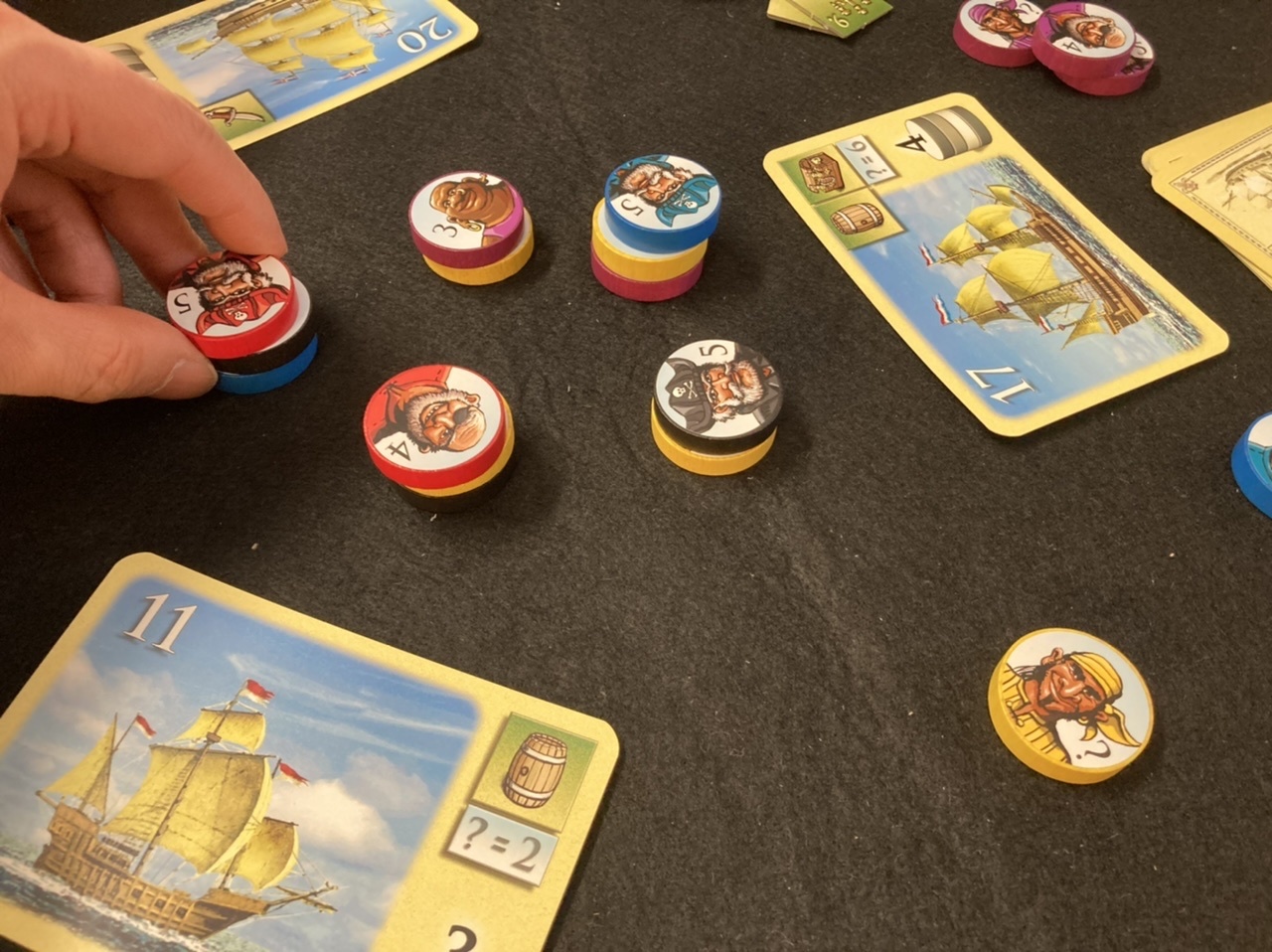 これはそのままではお金にならないのですが、ゲーム終了時に「最も多く」確保していた海賊に大量ポイントが入る仕掛けになっています。だから、単純に金額だけではなく、「あ~あの船を取りたい!」「宝箱をあと1枚確保したい!」という目論見が生まれるわけですね。