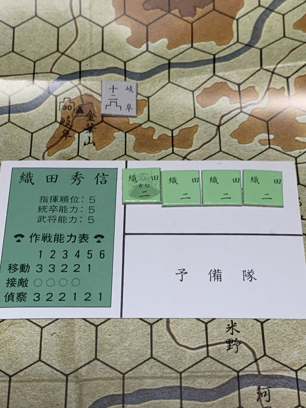 ユニットに印刷されている数字は戦闘力ではなくて防御レベルです。岐阜城の防御レベルは12、織田秀信の防御レベルは2です。数字が大きいほど強いです。城では大坂城の14、軍勢なら島津義弘の8が最強です。戦闘時はダイスを2個振って戦闘結果表の結果を適用します。写真の織田勢は4戦力(損耗していないユニットは1戦力、4ユニットなので1×4=4戦力)です。マップの岐阜城に記されている30という数字は籠城可能な部隊数です。写真はエポック社版です。