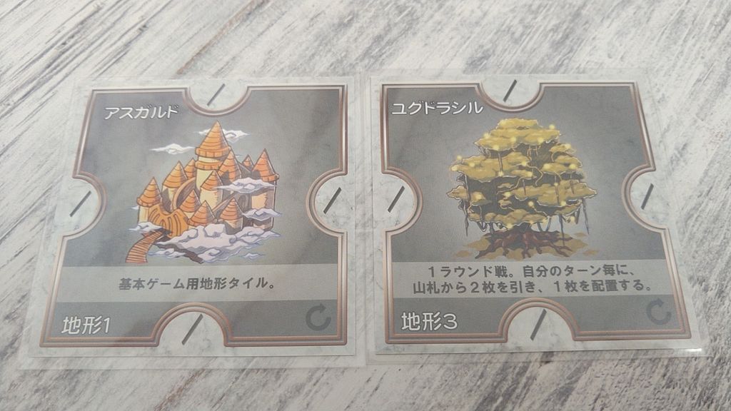 ゲームの終わりは5×5の25マスが出来たらですが、初期配置にある地形タイルからは最初に5列出来たところが基準になるので必ずしも地形が中央になるわけではないのも面白いです。