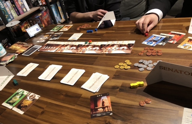 今回のプレイでは、4枚目の戦争カードを引く直前に、清算で元老院からの支持を10点にしたプレイヤーが勝ちました。私を含めて他のプレイヤー3人は9点だったので、最後皆で悔しがりました。