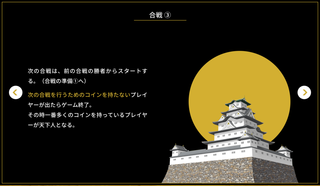 ラウンド終了時にいずれかのプレイヤーの持つ「万石コイン」がなくなったとき、ゲームは終了します。