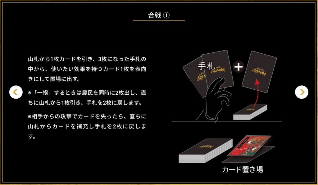 手元には、常に2枚の手札を持っています。山札から1枚のカードを引いて、