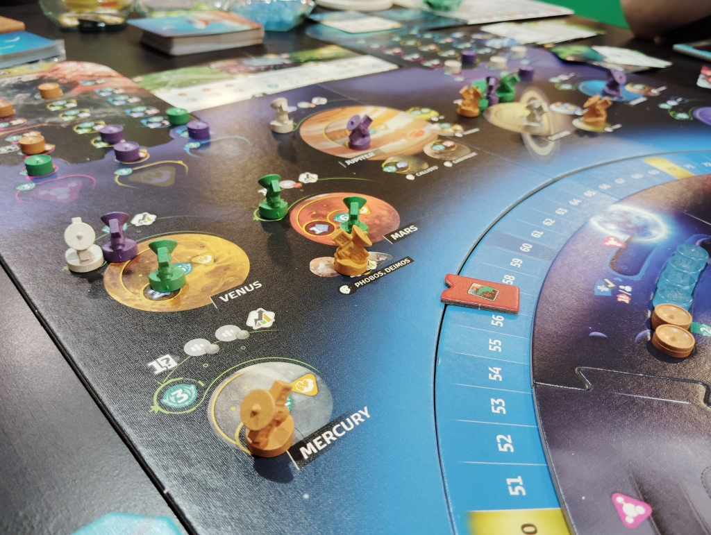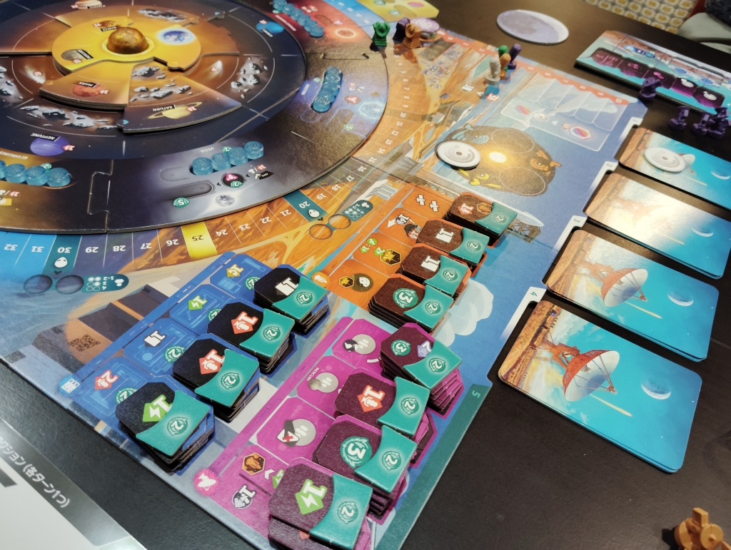回るタイミングは、誰かがラウンドから抜けたり技術開発をした時なので、5ラウンド中4回は必ず起こるのと、技術開発も1人2〜5回はするので宇宙の動きは予測していないと衛星が思わぬ場所に移動するかもしれません。