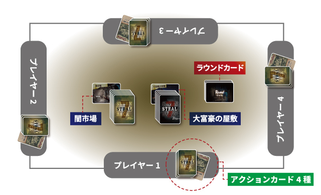 テーブルの中心に山札である「大富豪の屋敷」と、特殊アクションを入手したりお宝カードの捨て場になる「闇市場」をセットし、ラウンドカードを適当な場所に置きます。