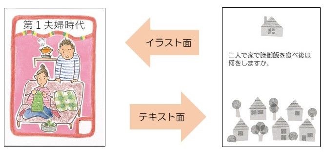 イラスト面には種類 ( ふりだし、第1夫婦時代、子ども誕生、子育て時代、大人育て時代、第2夫婦時代、オシャベリ、あがり)を表す絵柄が書かれています。右下にはマスの並べ順を表す番号が書かれています。