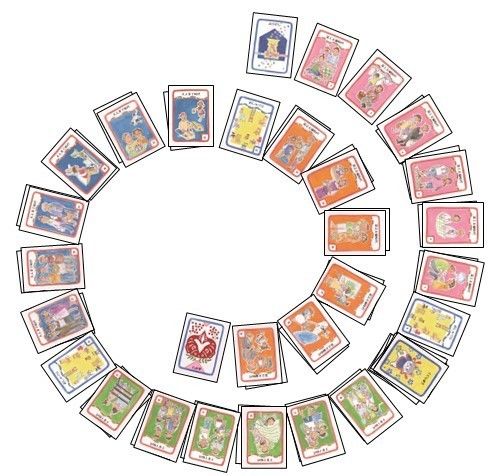 このゲームはスゴロクですが、大きな紙などにマスが書かれている盤面は使いません。そのかわりに、テーブルなどにマスカードを並べることで盤面とします。イラスト面を上にして番号順にマスカードを並べてください。同じ番号のカードは重ねて一つのマスとします。重ね方に決まった順番はありません。マスを直線的に並べると長くなるので、渦巻き状など、テーブルの大きさに合わせて並べてください。プレーヤーが自分のコマを決めてふりだしに置いたら準備完了です。
