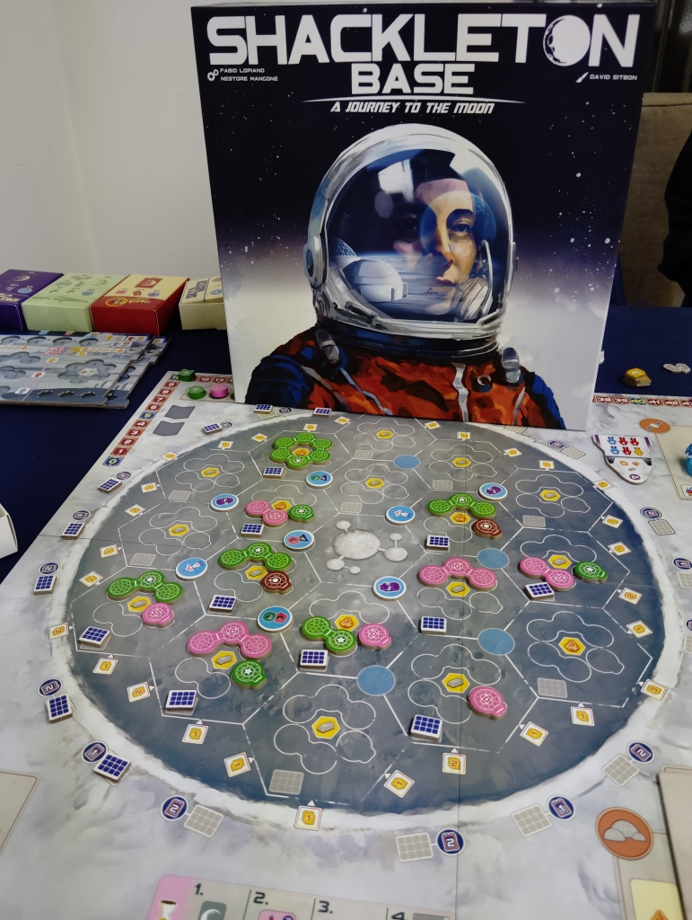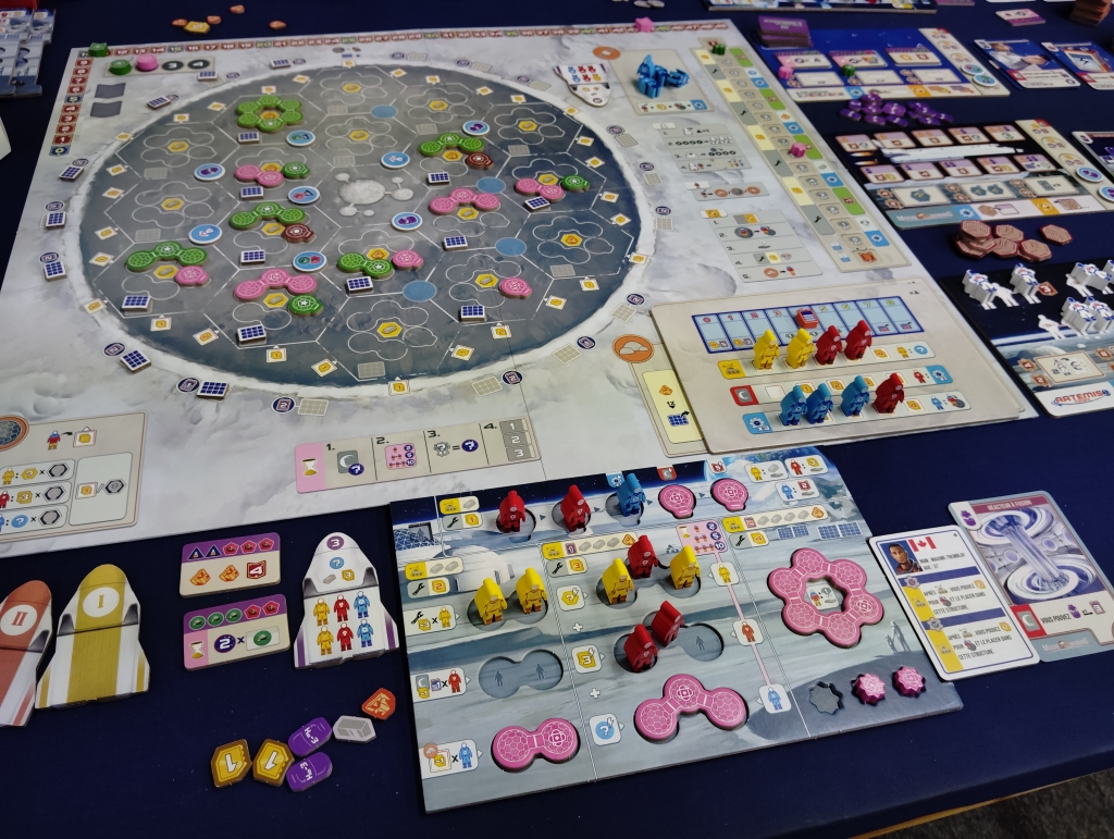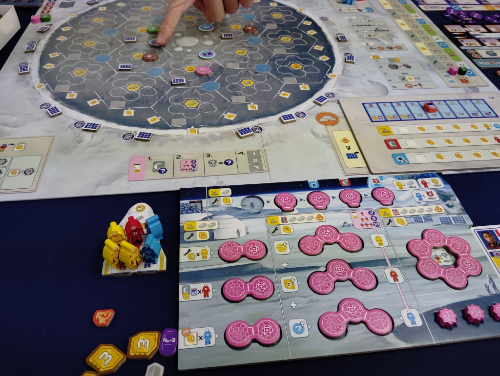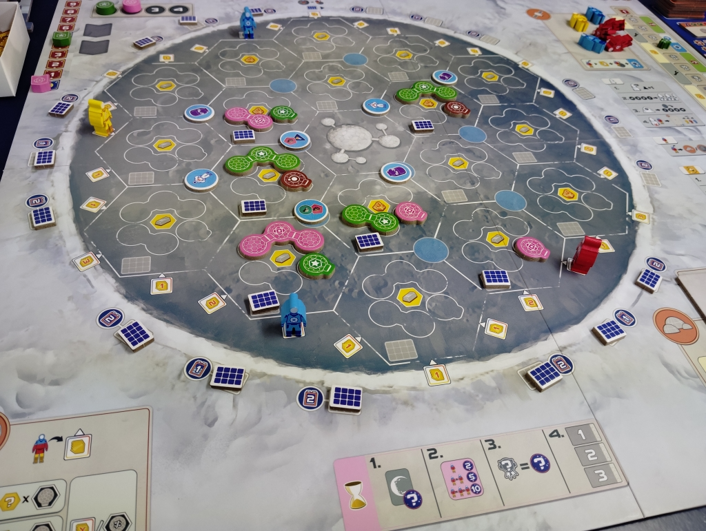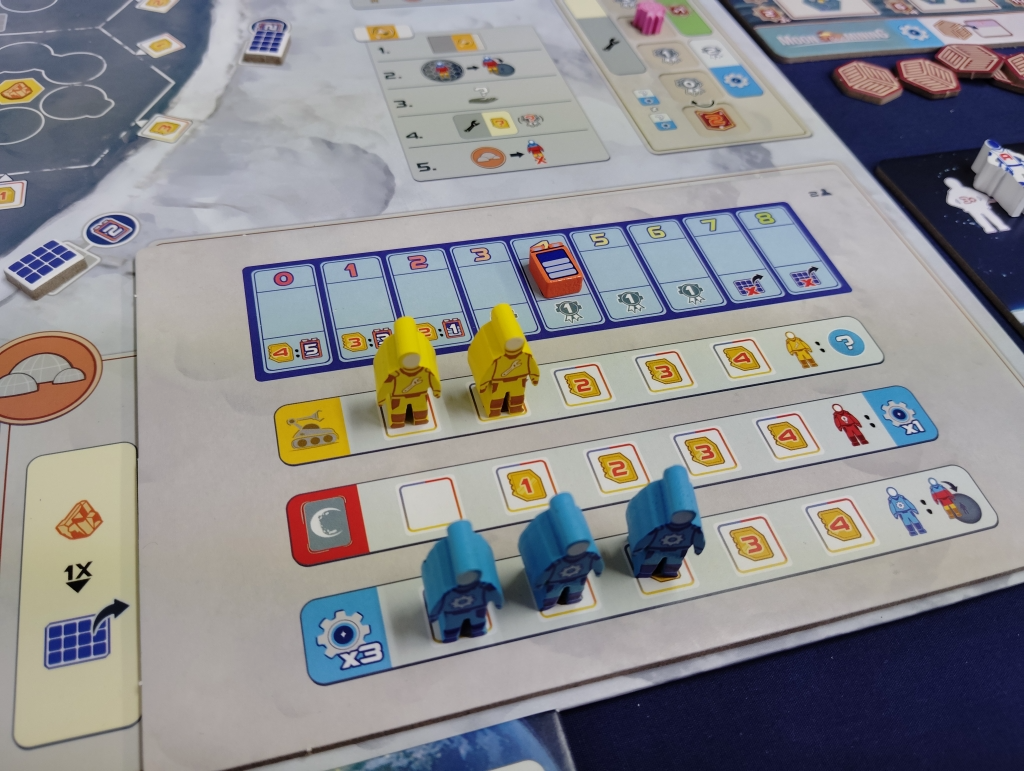月面基地にワーカーを配置して資材や資金、特殊効果を実行したり、アクションスペースにワーカーを配置して基地の建設やカードの購入、特殊アクションを複数回実行したりします。