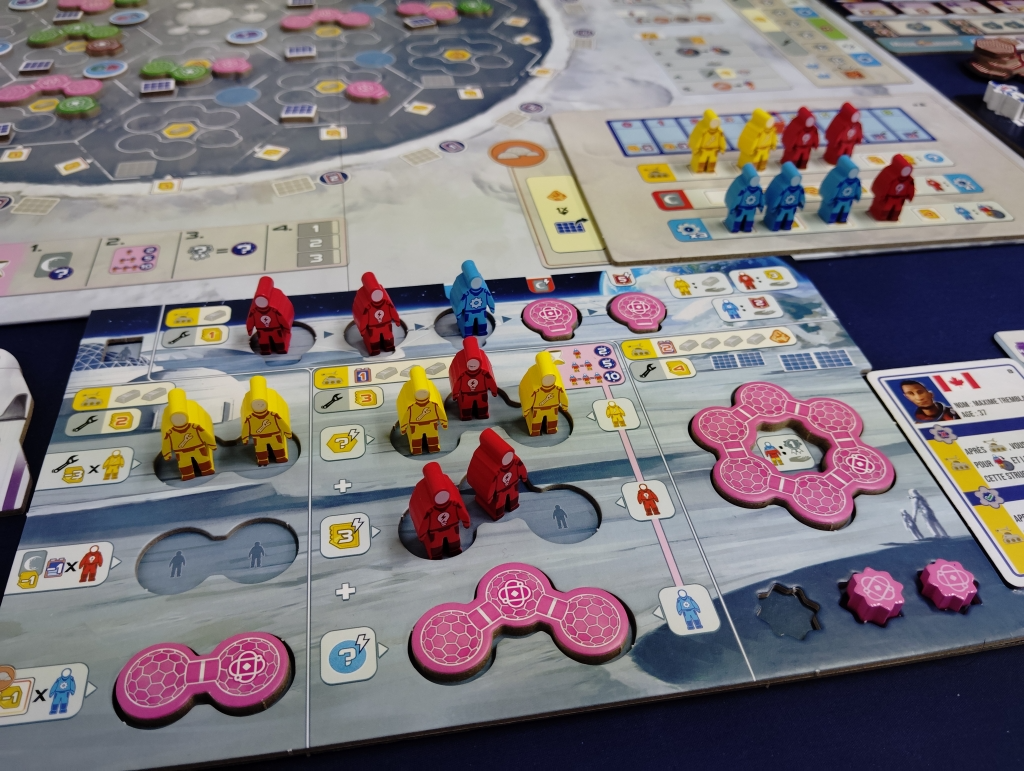 基地を建設していくと個人ボードに人材を受け入れるスペースができるのと、ラウンド終了時に月面の各エリア(ワーカーの線上にあるエリア)の基地マジョリティを確認して、基地の大きさ合計が一番のプレイヤーが配置されたワーカーを個人ボードの空きスペースに配置できます。