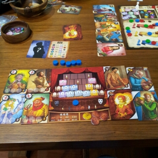 ゲームのほうは、役者や舞台衣裳、舞台を作る方にを雇いましてよりよいものにしていきます。6ラウンドしまて4ラウンド目と6ラウンドはお披露目会(得点計算)があります。