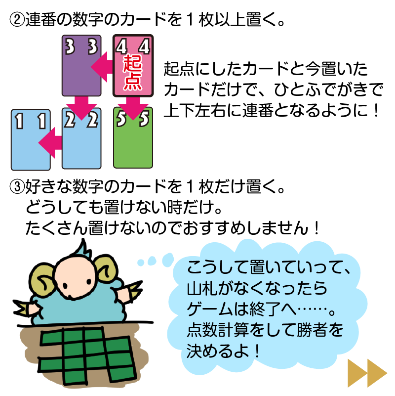②起点にしたカードに対して、連番(2-3-4のように)になるようにつなげる。