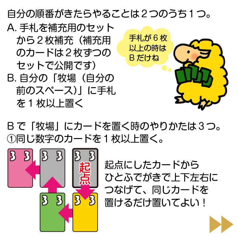 自分の順番がきたら、手札を補充するか、牧場(自分の前のスペース)に置くかを選びます。