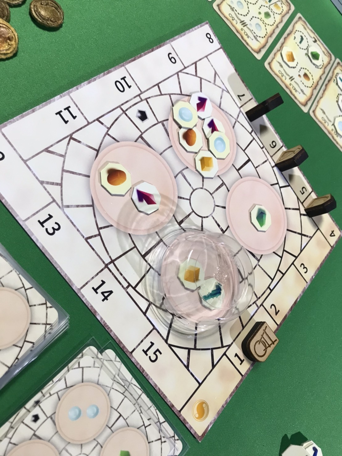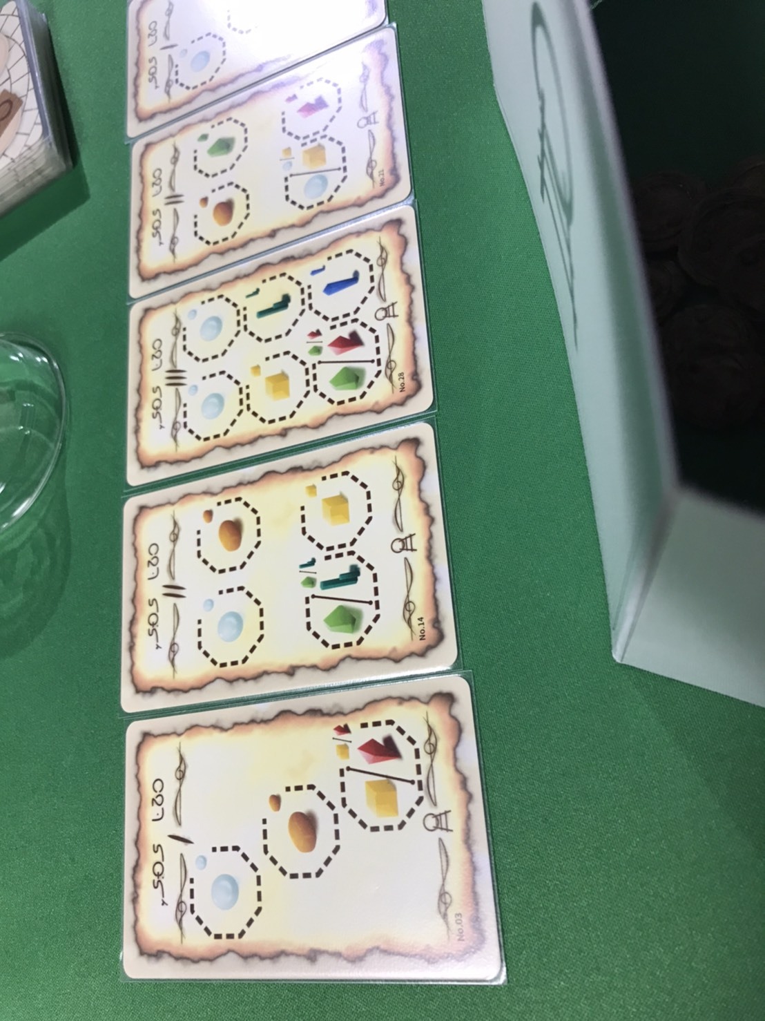 各プレイヤーは、競り落とした宝石で自分の前にある“注文書”を完成させていくんだけど、注文書は左右の端から完成させていかなくてはならない。したがって、左右の注文書に必要な宝石から先に入手していく。中央にある注文書に使う宝石を先に競り落としてもそれは配置できず無駄になってしまう。(ストックは出来ない)
