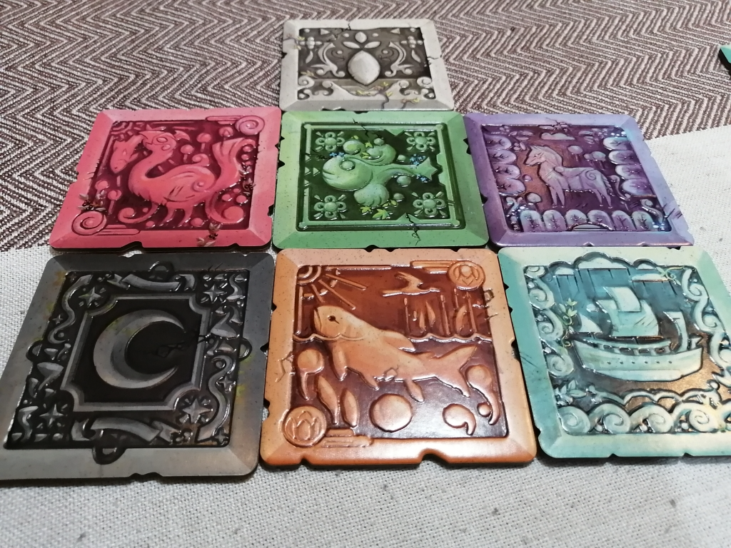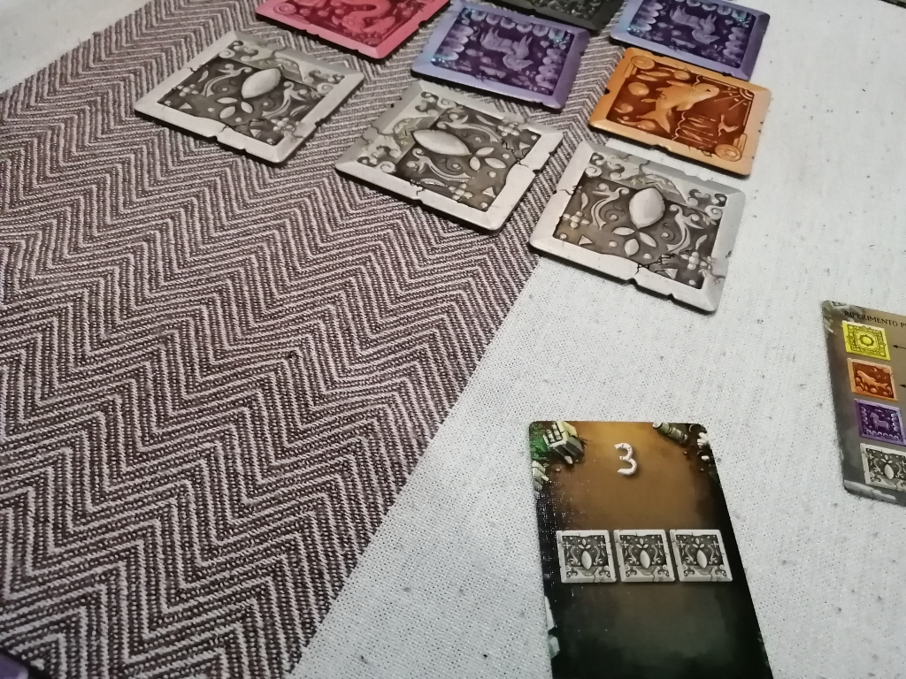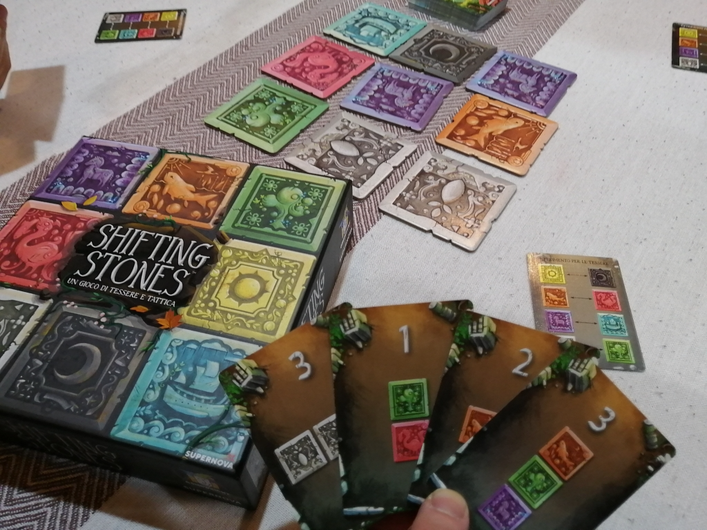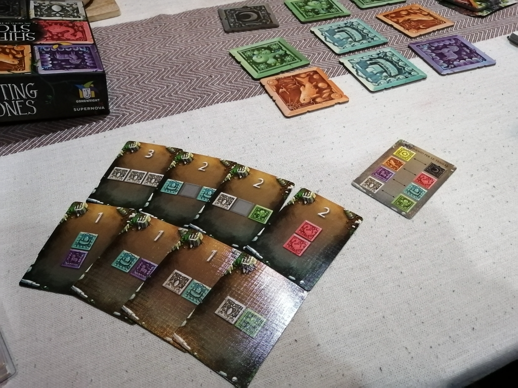 共通のタイル9枚を移動させたり、ひっくり返したりしてカードと同じ配置になれば得点化。誰か得点化を8枚したら手番を一緒にして終了。