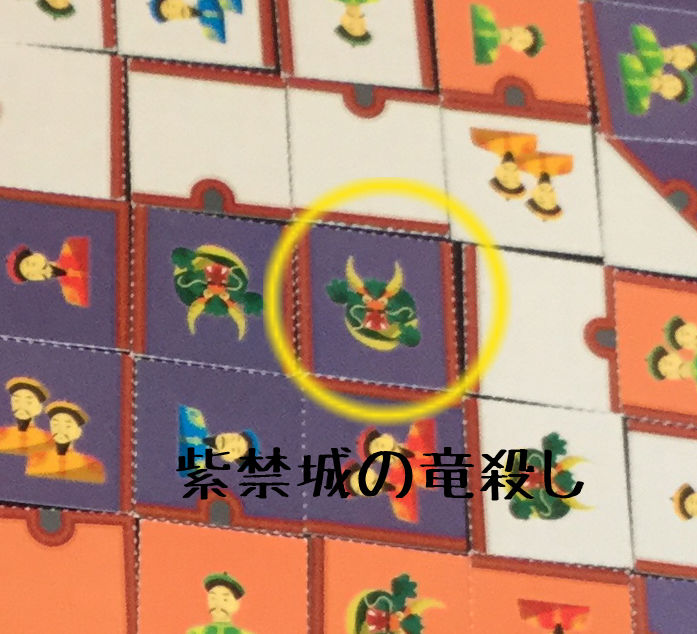 内容的にはタイル配置+エリアマジョリティ……と思わせつつ、実は既に出来たエリアにビンジョーして隣接エリアの点数を掠め取るゲームです。特に後半は大きなエリアの取り合いはそこそこに、一人で小さなエリアを作ってちゃっかり高得点を独占するのが強いです。また、所々に死にエリアが出来るので、他人に取らせたくないドラゴンアイコン(点数+3点)をわざと捨てるなど、キャラのアイコンがなくてマジョリティに貢献しないパネルをいかに処理するか、等も重要です。タイルは常に一枚しか持てないので、手札の中からどれを出すという選択の余地がないのがまたいやらしくてとてもいい!