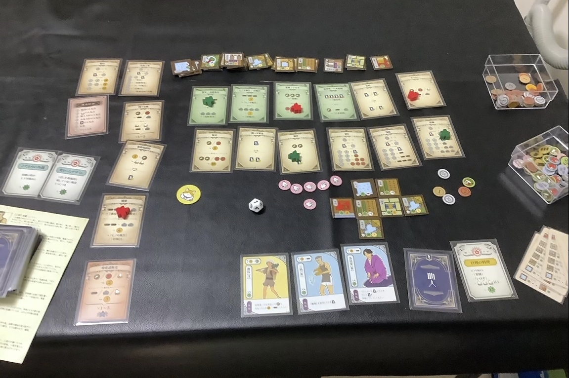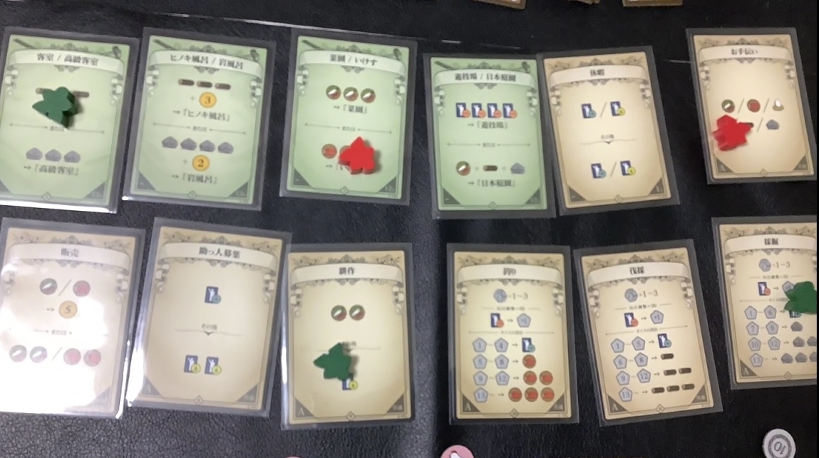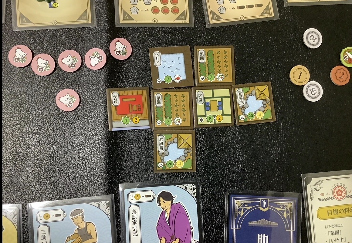 基本カードゲームで個人ボードは受付のタイル一枚から旅館を作っていくという拡大生産も入っている。