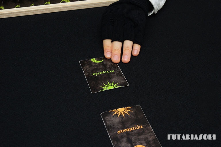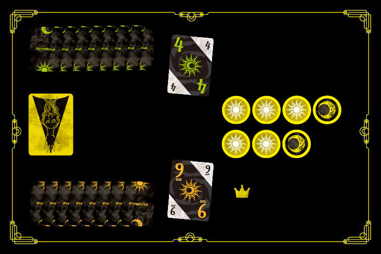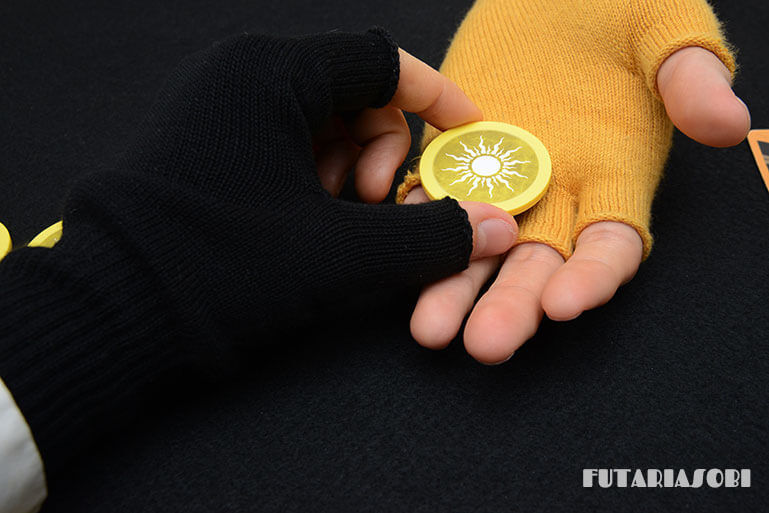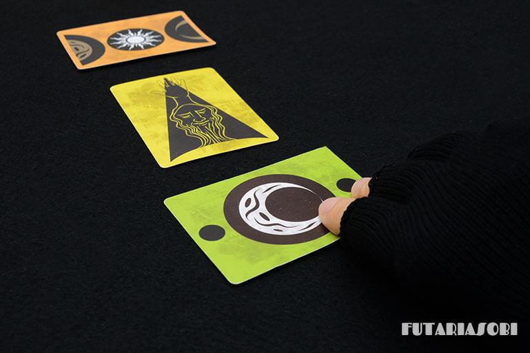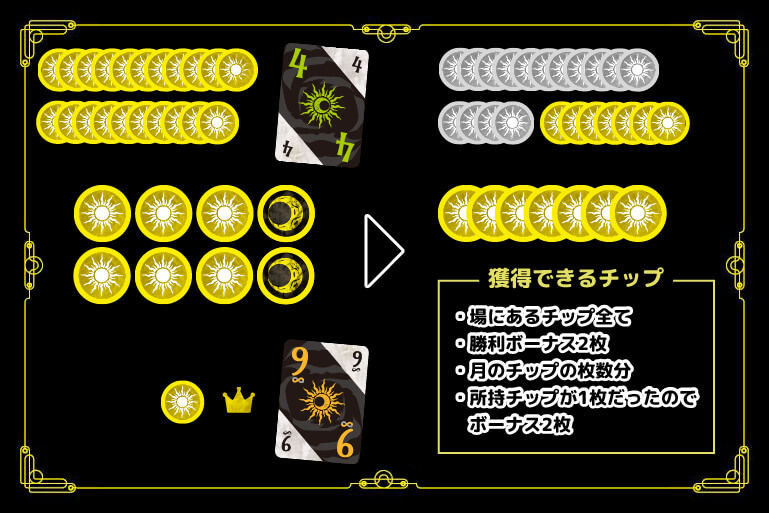 - 自分の所持するチップを1枚「太陽」か「月」の面を表にしてテーブルの中央に置く。