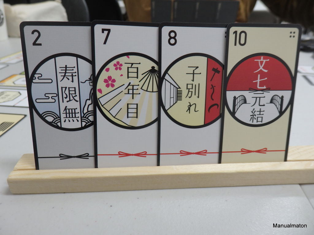 また、同じ演目を3回以上並べることで得られる「十八番」や特定の演目を場に出すと得られる「称号」と言ったシステムが数値のみの勝負を奥深いものへと変えています。(数値の低い演目を出さないとマイナスになる称号すらあります!)