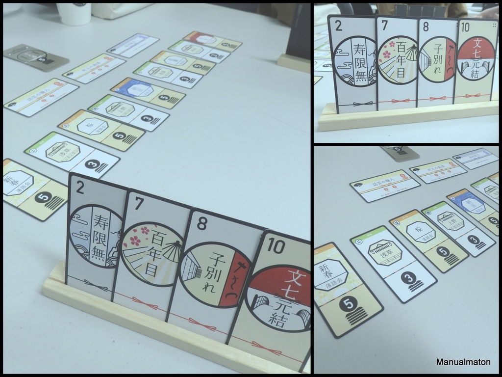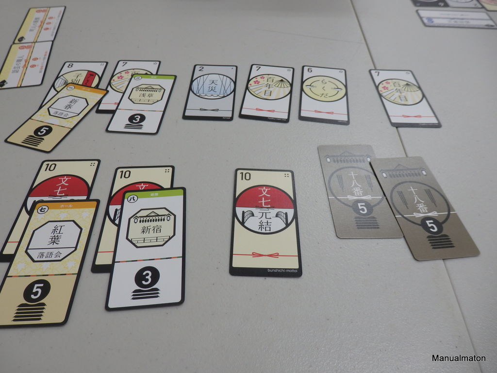 各落語会(ラウンド)の勝者は単純に演目の数値の高い人なので大ネタを仕掛けたくなりますが、そうなると次の落語会で仕入れる演目カードの選択肢が大幅に減ってしまうと言うジレンマ。