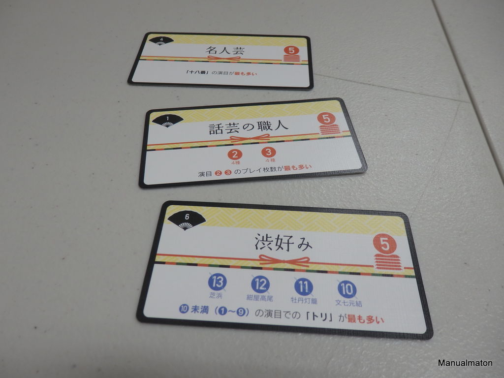 - トリは演目の上に落語会カードを置いて得点の目印とする。