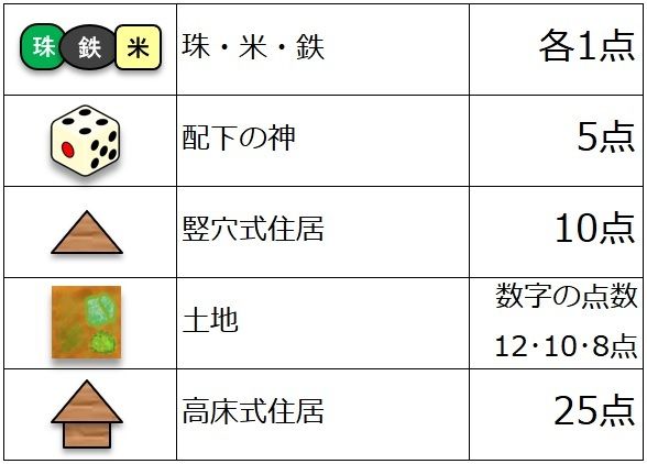 初期状態が、サイコロ3つ(5点×3)、竪穴式住居(10点×2)の合計35点から