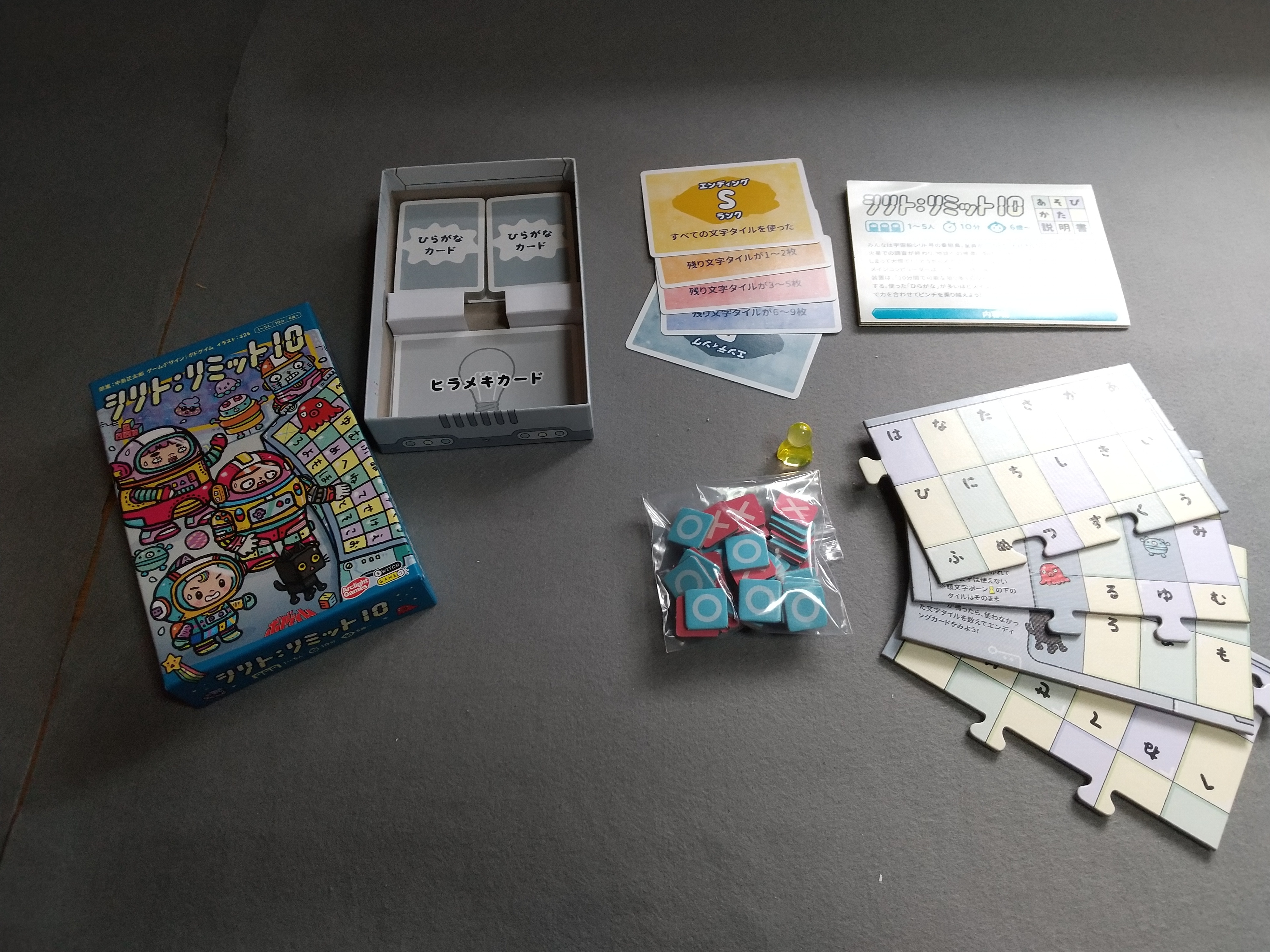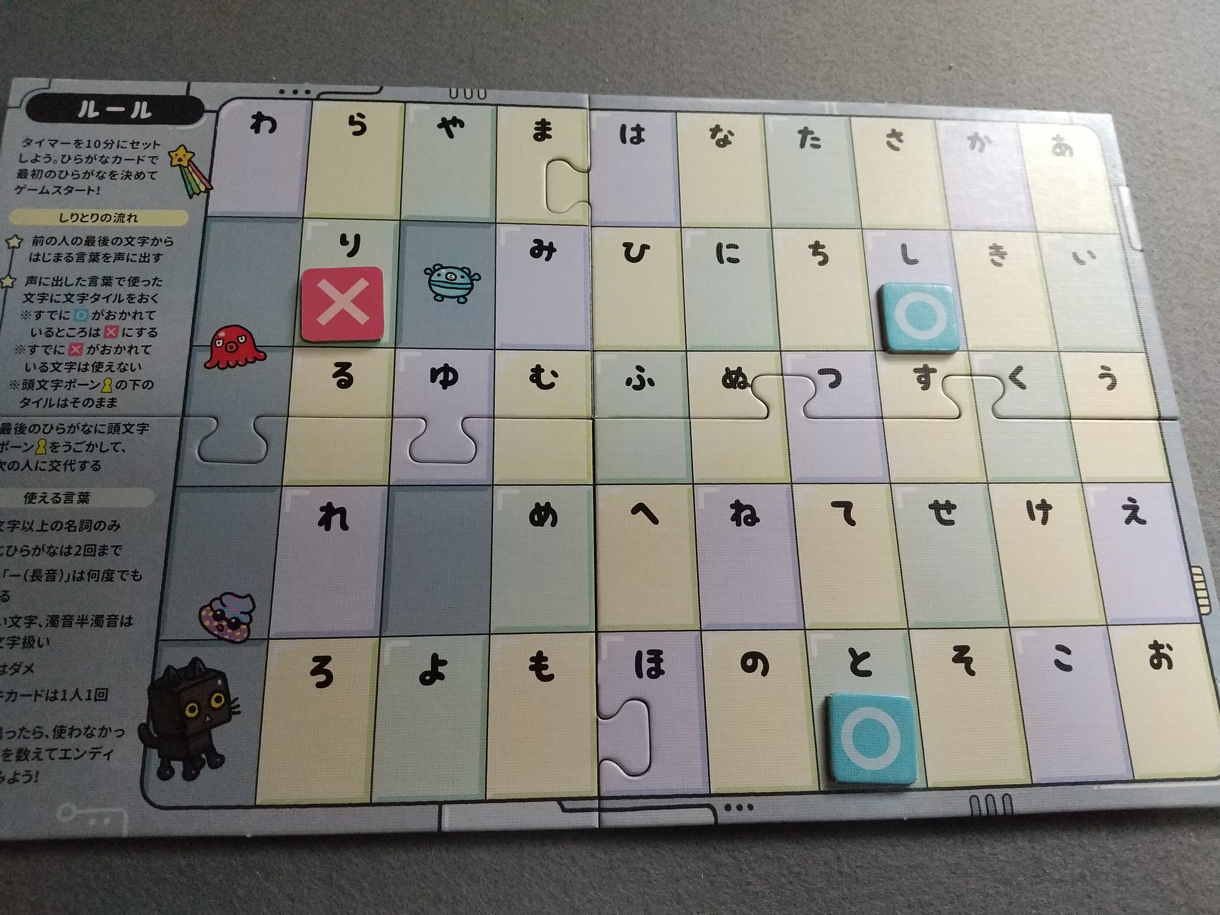 10分以内に①3文字以上の名刺のみでしりとりをし、②使った言葉にタイルを○の面で置き、2回目使った言葉はタイルを×の面にして、③全てのひらがなにタイルを置ければ勝ち。