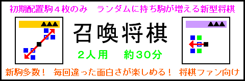 『召喚将棋』は、初期配置は各人2枚(王将&酔象)だけで、