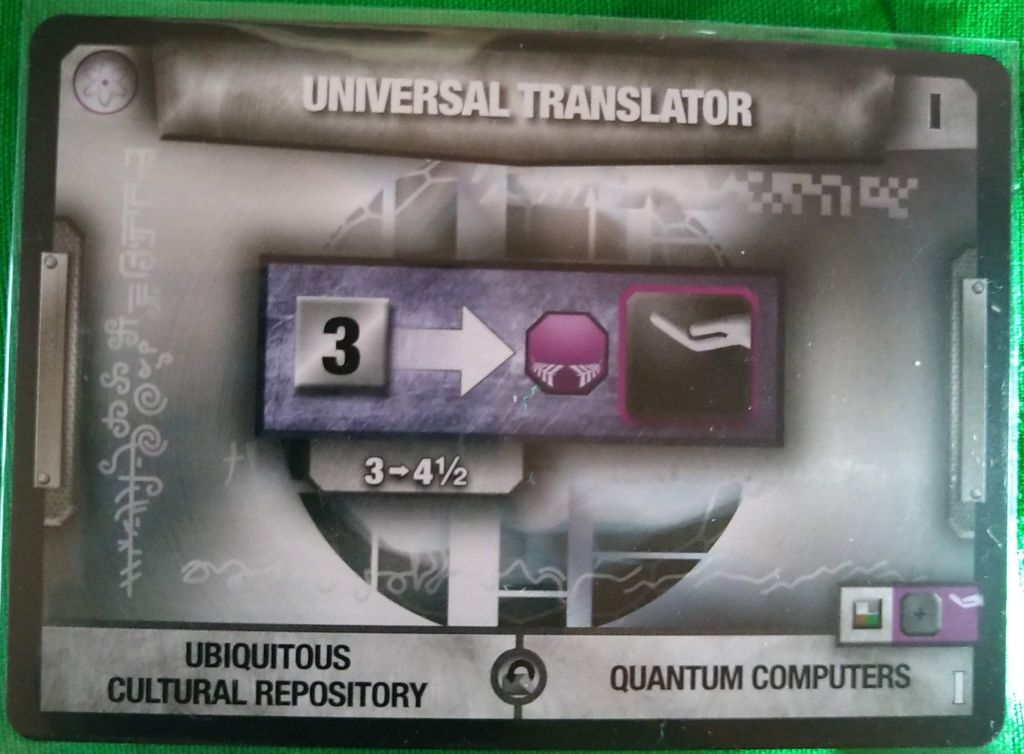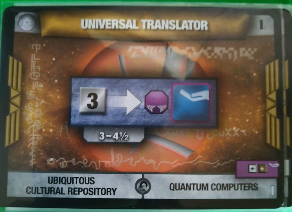 新しく発見された技術は紫の矢印のコンバーターですので取引フェイズにこのリソース(緑6か黒4)を消費すれば、ターンに応じた勝利点とユニバーサルトランスレーター、万能翻訳機が開発されるのです。