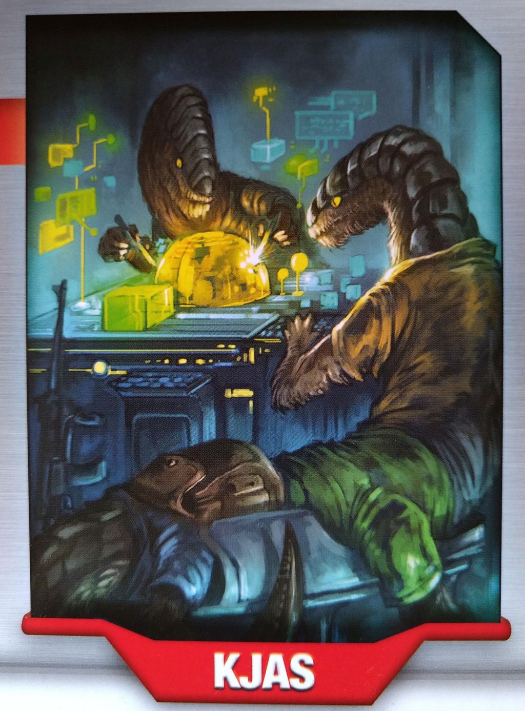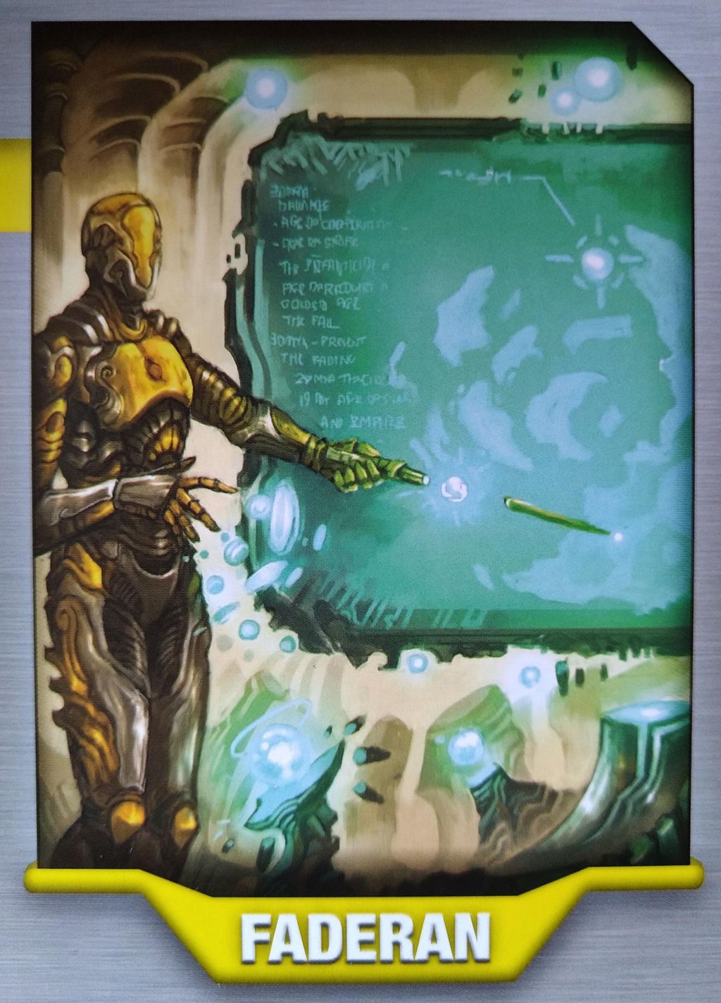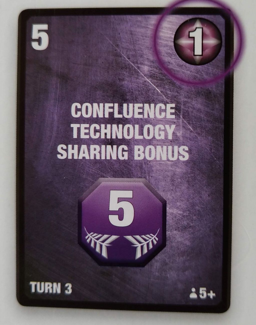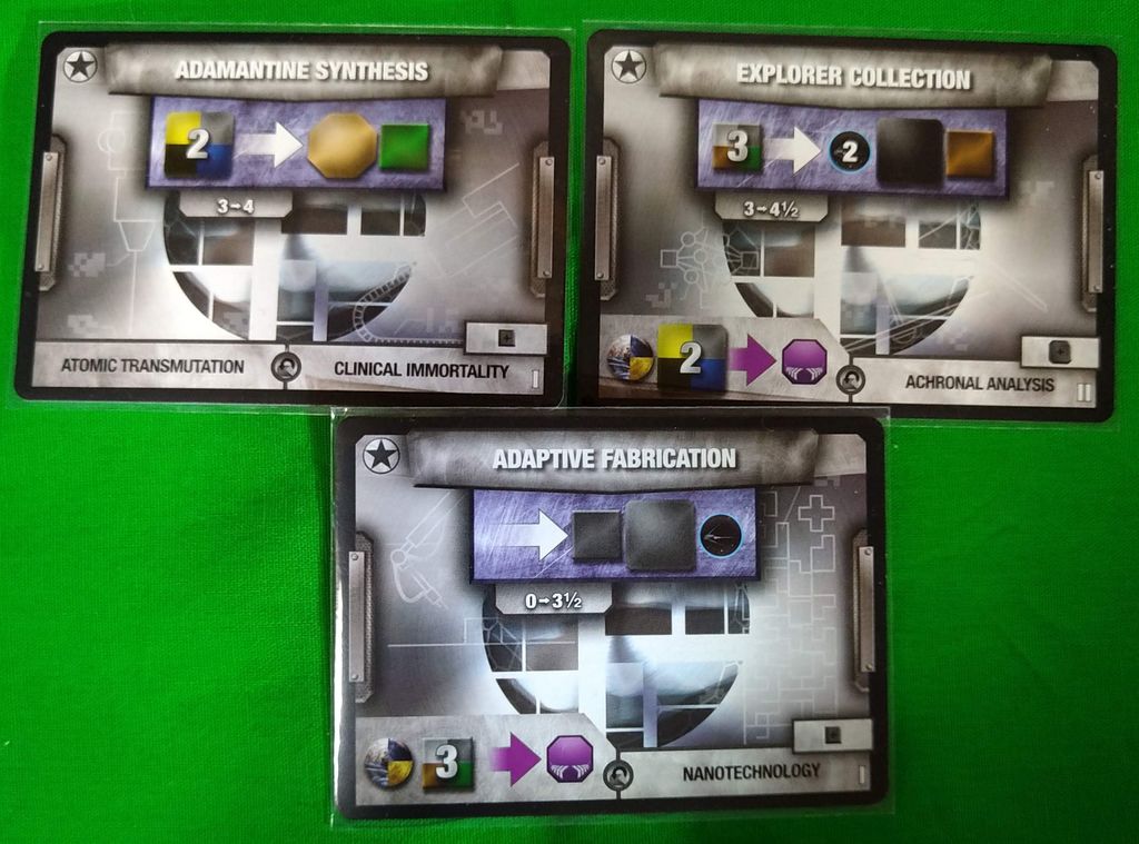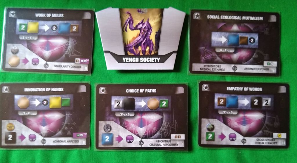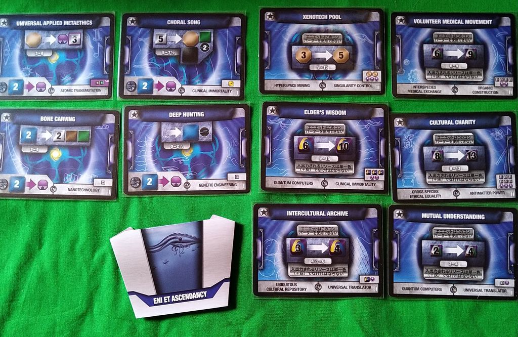 初期カードと特殊コンポーネント 灰を生み出せないUNITYといった感じで、一見すると普通の構成です。 ですが、普通は共有される技術を、この種族が開発した場合、その技術は合流点フェイズでも共有されることがありません。(その代わり右の上の写真のように、通常技術開発で5点得るところが1点しか得られません) 開発した技術、そのものを取引材料としてライセンス料をとって、技術を共有することができます。 通常、交易フェイズで開発→エコノミーフェイズ→合流点フェイズで共有となりますが、交易フェイズで技術供与できるという利点もあったりします。 そう言う側面から、序盤は孤立しやすく、交渉のきっかけを得にくい玄人好みの種族になります。 |