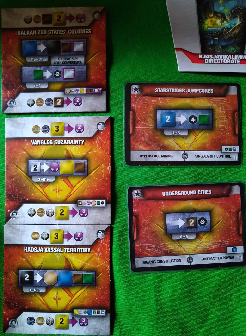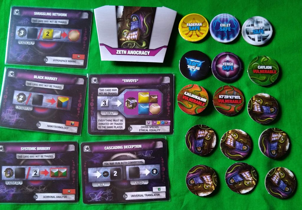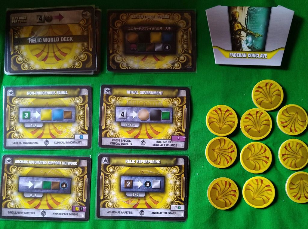小キューブ 白:文化 緑:食料など 茶:産業 大キューブ 黒:情報 青:バイオテクノロジー 黄:電力 大小込み灰:ワイルド 八角形ベージュ:ハイパーテクノロジー 宇宙船:ぶっちゃけお金です 勝利点 |