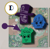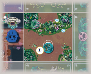青は沼地タイル(B)を反転して探索します。このタイルにアイテムアイコンは1つしかないので、ドローパイルからアイテムを1つ引き、アイコンの上に表向きに配置します(D)。 |