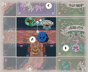 Aから、青は右側の沼地タイル(B)のみ探索できます。実際、未探索の学校タイル(C)は、青が置かれているタイルにエリアを隔てる壁があるため、青がいるスペースに隣接していません。 |