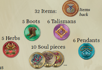 32のアイテム: 5 ブーツ 5 ハーブ 6 タリスマン 6 ペンダント 10 魂の欠片 |