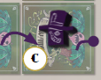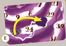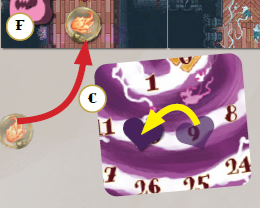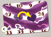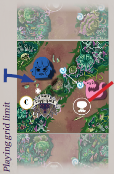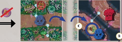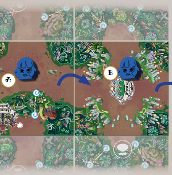 そして、行(または列)の両端は隣接していると見なされるため、再び右に移動して禁断の洞窟(C)のスペースに入ります。 そこではミニオンがタイル全体を占めていると考えられるため、青がどのスペースにいてもミニオンを倒してサプライに戻し、1ダメージを受け、それに応じて個人ボード上の体力トラッカーを移動します。 |