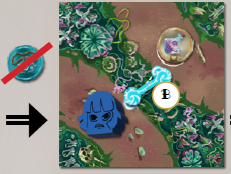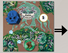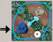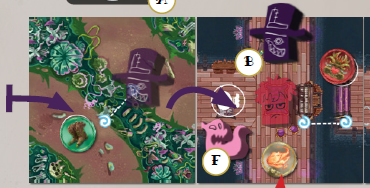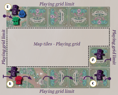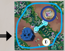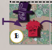 開始位置(A)から、青は次のことができます: - 左に移動して学校タイルに入る、 - 上または右に移動して、森タイルに入る。 下のスペースに移動することはできません、2つのスペースは同じマップタイル上にありますが、木で区切られており、点線でしか接続されていないためです(つまり、これらのスペースを接続するにはポータルが必要です)。 |