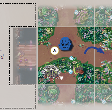 あなたがいるスペースに隣接する裏向き(未探索)のマップタイルをめくります - 隣接関係はグリッドの端で「ループ」していることと、タイルの方向はランダムであるべきであり、どのプレイヤーも選択できないことを覚えておいてください。