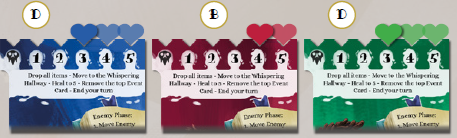 邪悪な魔術師はセットアップのステップ5で配置されたマップタイルDに戻ります。青と緑の両方がこのマップタイル上にいるため、それぞれ1ダメージを受け、彼らも自分の体力トラッカーを移動します。 |