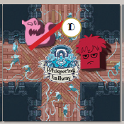 次に、グリッドの中央にあるささやく廊下マップタイルに赤のポーンを配置します。ミニオンがそこにあり、ただちに捨てられます(D)。 |