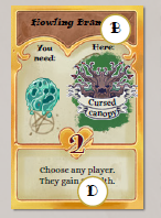 青は禁断の洞窟(C)に到達したいため、移動アクションを2回実行することにしました: 最初の移動で、彼はミスティックメドウ(B)に入ります。 |