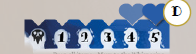 青のターン開始時には全員体力が5でした。赤は邪悪な魔術師が自分のいるタイルに入ったため、1を失います。青と緑は魔術師が自分のタイルに入ったために1を失い、配置されてただちに捨てられたミニオンによりさらに1(合計2)を失います。 |