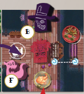 その進路に沿って、魔術師は赤がいるタイル(B)に入り、そのプレイヤーの体力を1減少させます。 |