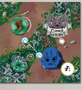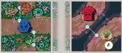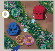 青はデッキから一番上のストーリーカードを引いて、邪悪な魔術師を2スペース移動するように指示します(A)。 |