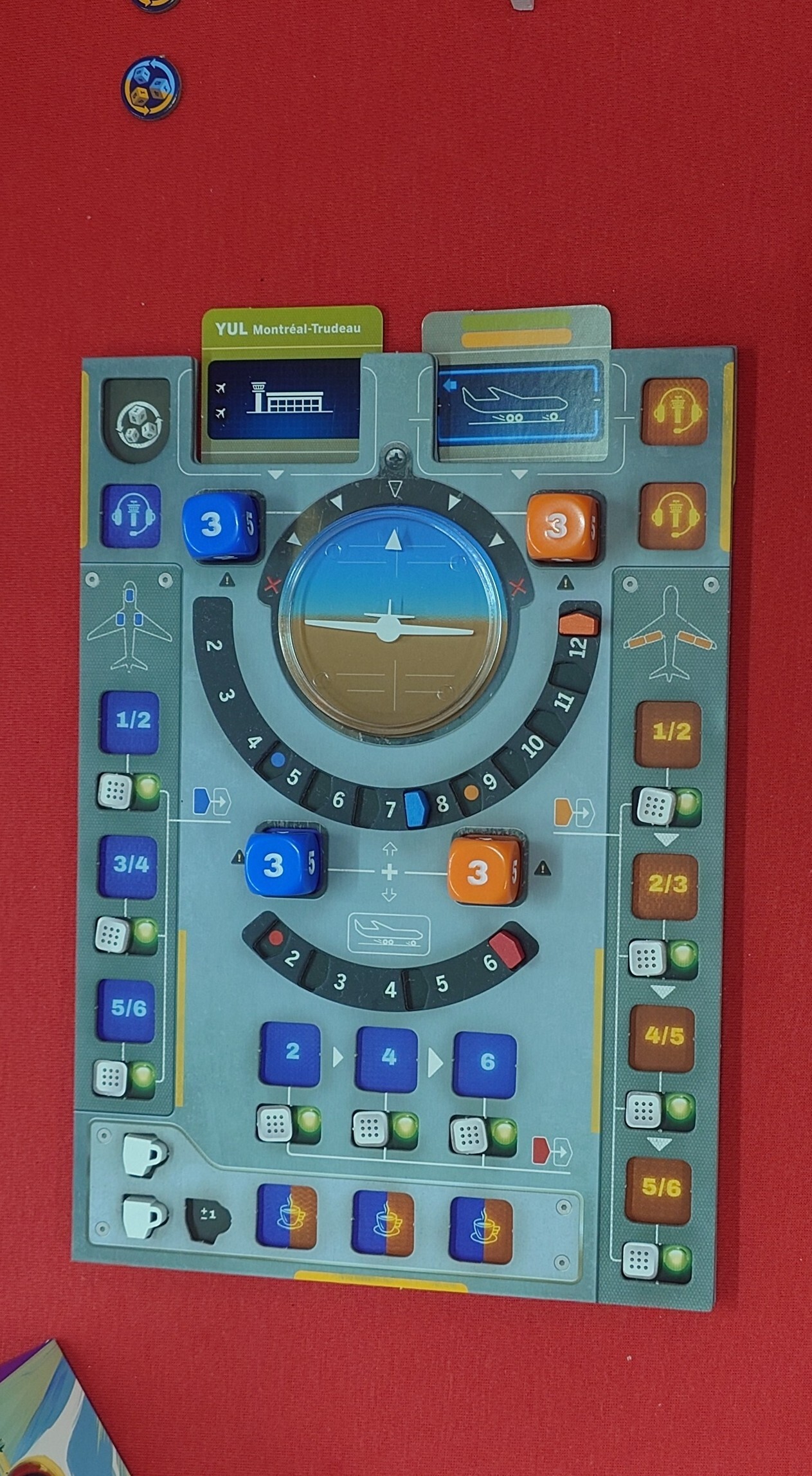 機長の大事な仕事にブレーキがあり、これは2→4→6の🎲を7ラウンドのどこかで配置する。当然だが7ラウンド目はスピード、即ち2人の🎲の和がブレーキ値以下であることが着陸の条件だ。